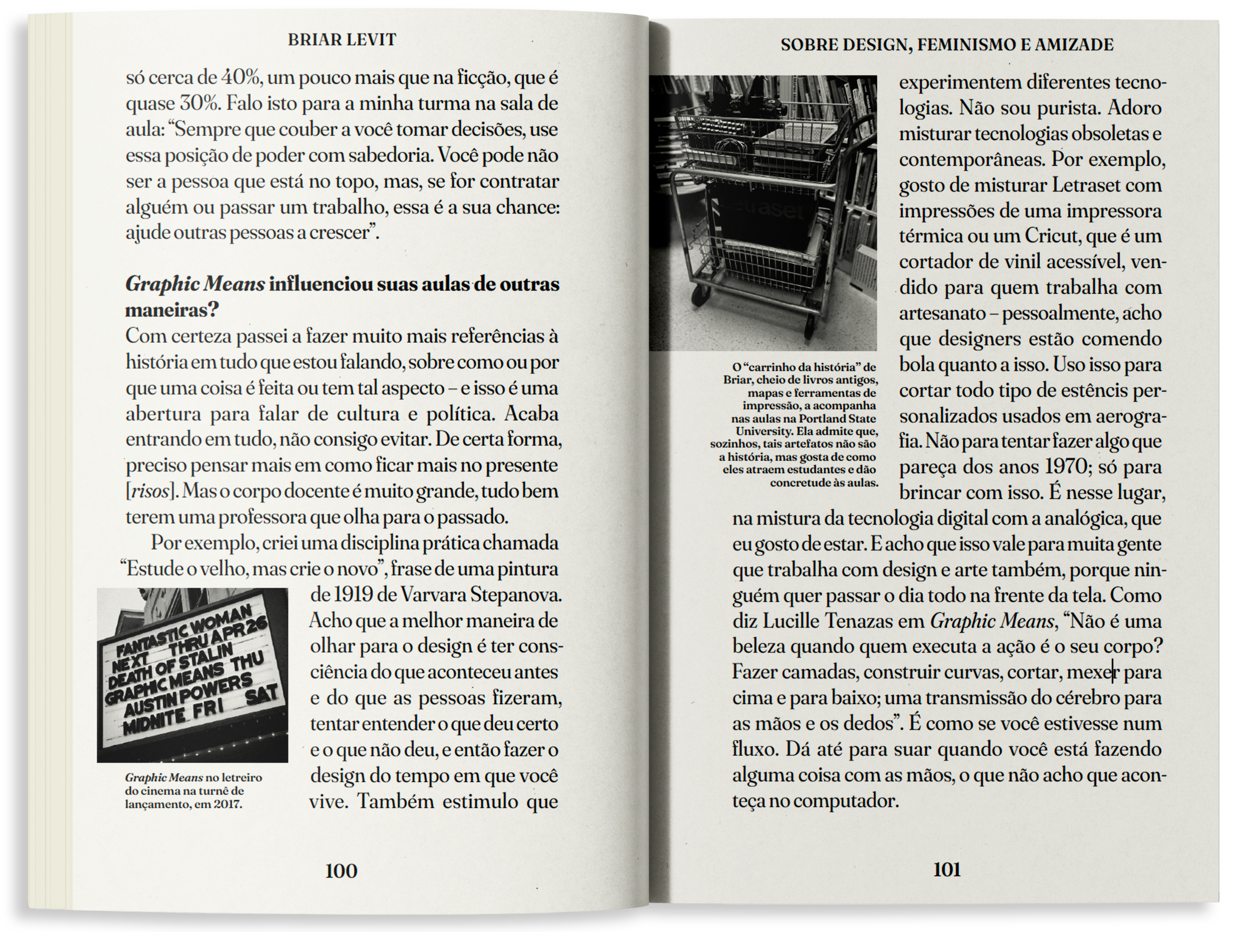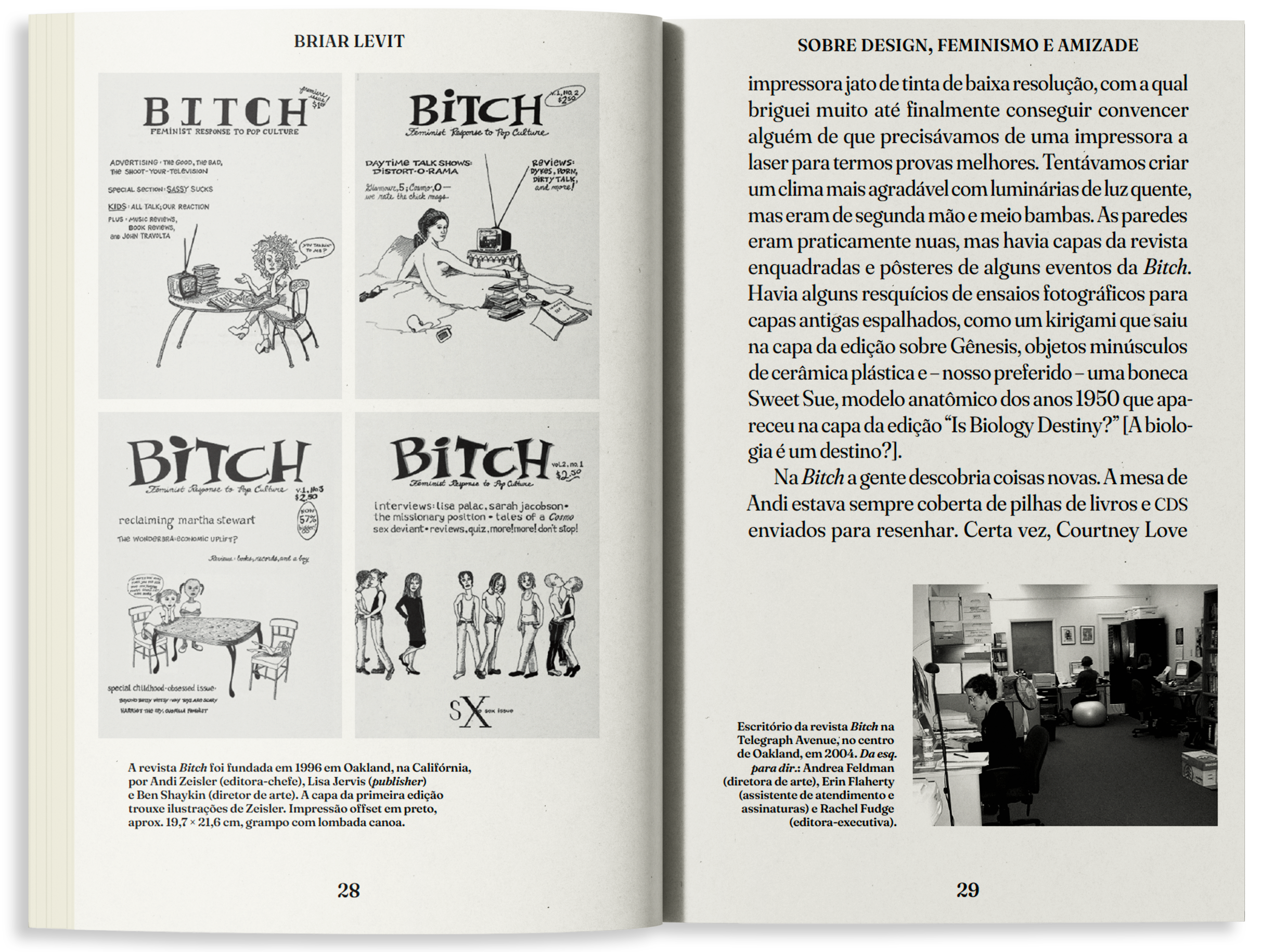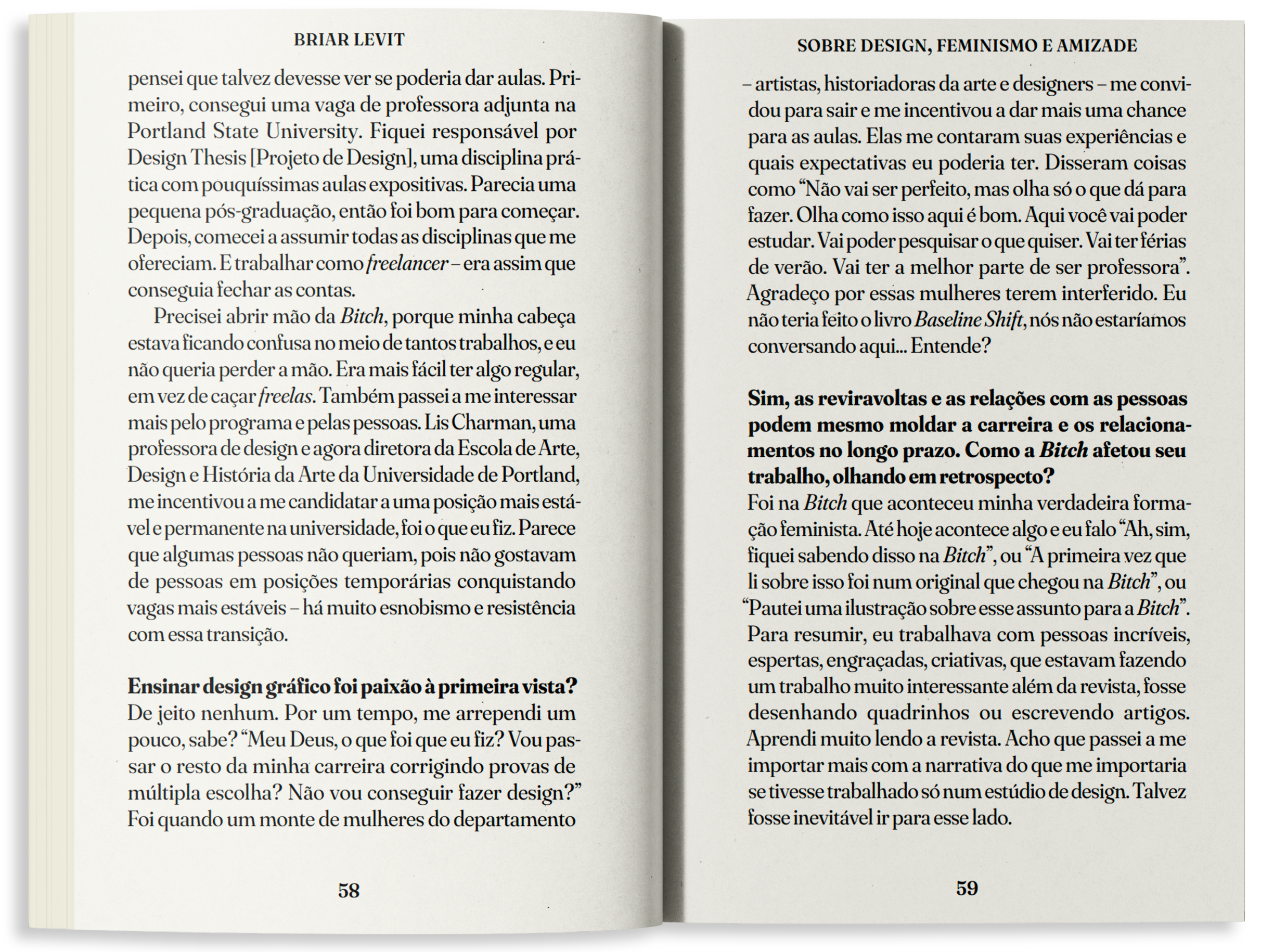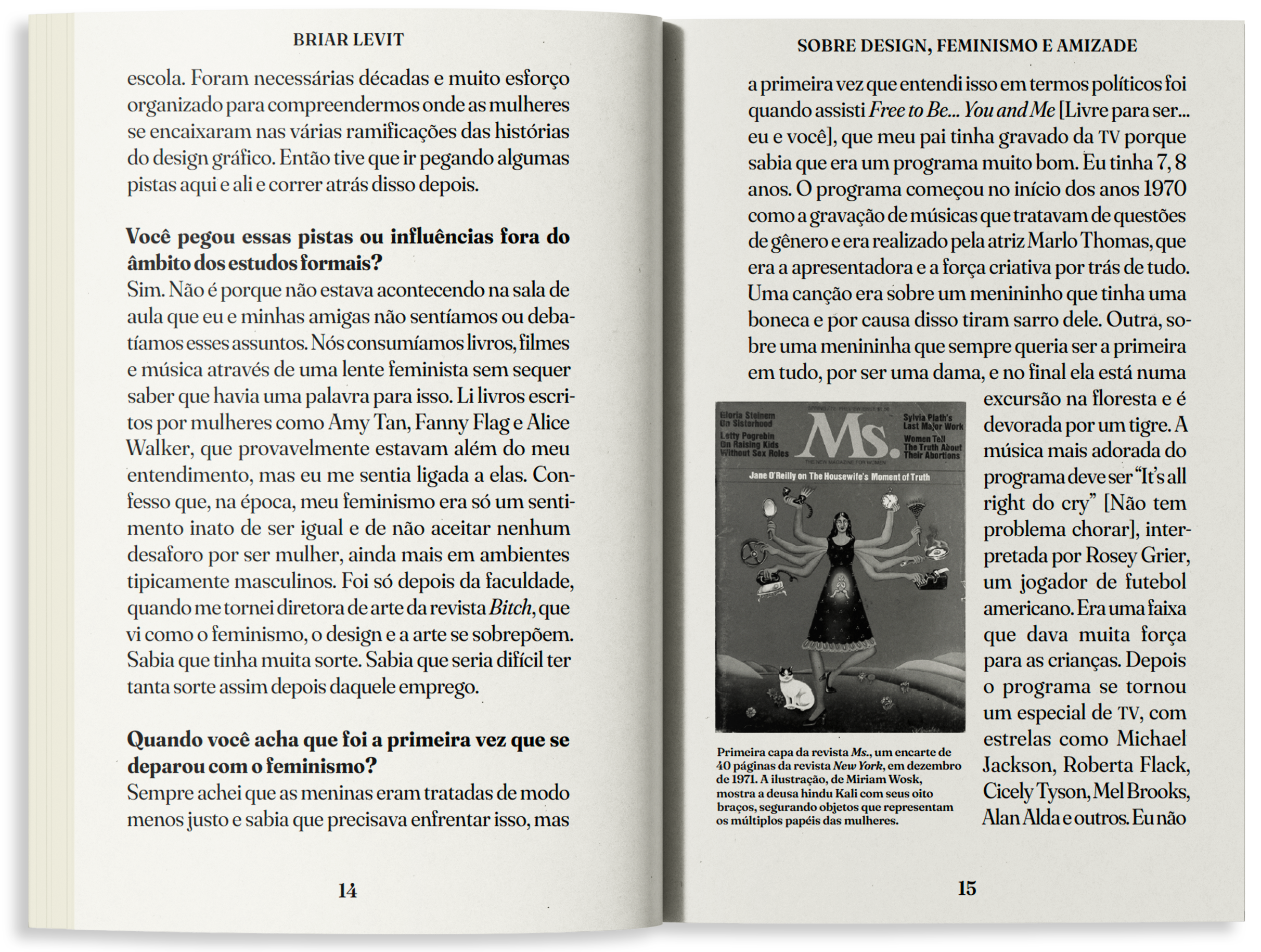 Como uma caminhada em terreno desconhecido, a trajetória de Briar Levit pelo design é cheia de surpresas e reviravoltas. Da agitada redação da revista Bitch até passeios pelas trilhas em Kent, na Inglaterra, aos melhores brechós de Portland, Briar transita pela sala de aula, pela escrita, pela edição, pelos arquivos e pelos documentários. Esta entrevista ilustrada acompanha as curvas desse caminho numa paisagem feminista em transformação, lançando luz sobre como design e ativismo se cruzam, as micropolíticas do trabalho e a importância da amizade. Uma conversa franca sobre como rotas não planejadas podem levar aos destinos mais reveladores.